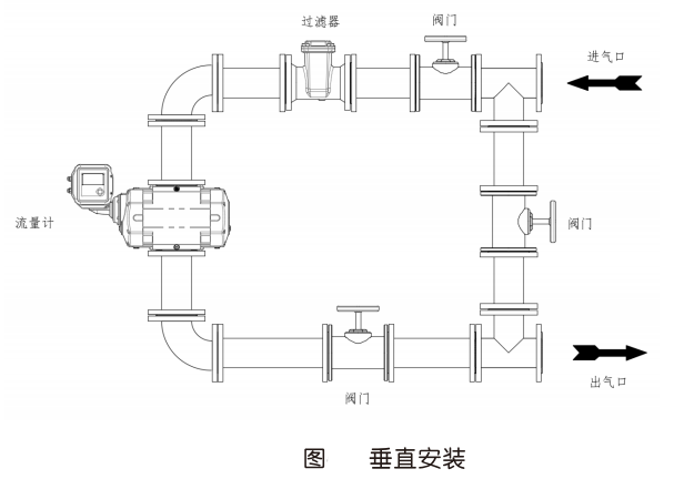 垂直安裝(見圖1):當垂直安裝時,氣體進口端需在上方,氣流由上向下流動,即上進下出,建議用戶采用垂直安裝方式,垂直安裝有助于轉子對雜質的自清潔能力。