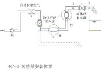 智能電磁流量計(jì)傳感器正確安裝位置 智能電磁流量計(jì)傳感器安裝方向可水平、垂直或傾斜。因?yàn)榱髁坑?jì)在工作時(shí),始終要求測(cè)量管內(nèi)充滿被測(cè)介質(zhì)。水平安裝時(shí),為了確保這一點(diǎn),必要時(shí)傳感器安裝位置的標(biāo)高可以略低于管道的標(biāo)高,如圖7-1,或使傳感器的下游具有足夠的背壓,如圖7-2。